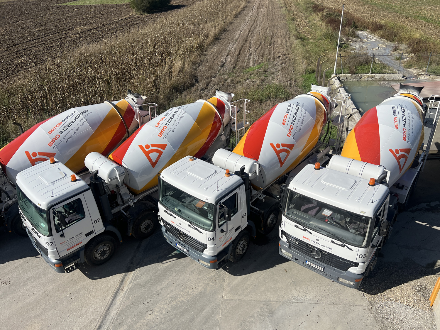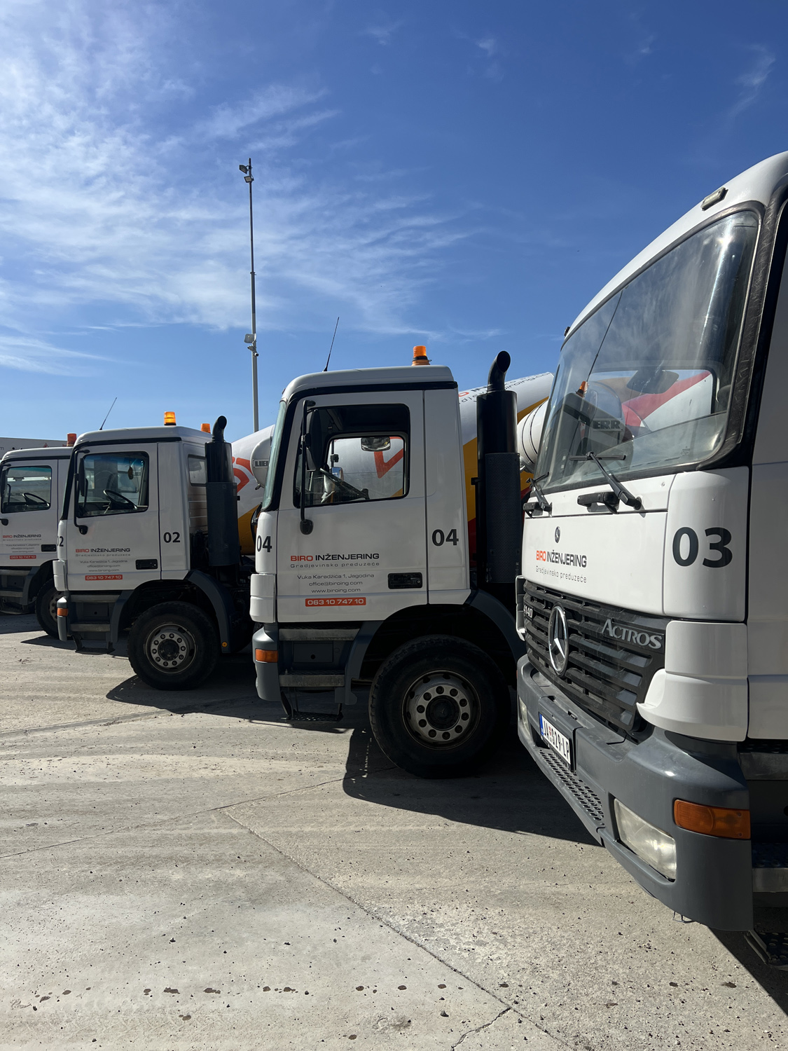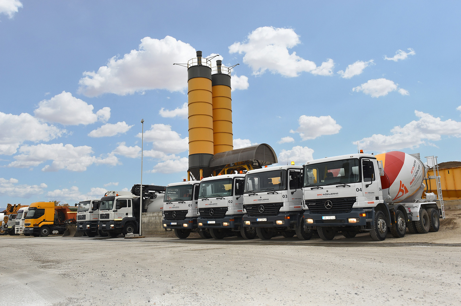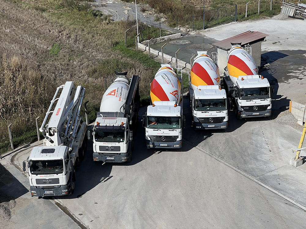 ● Mikseri za prevoz i isporuku betona (9–10 m³) – 6 kom ● Auto pumpe za beton (različitih dometa i kapaciteta od 18–37 m) – 2 kom ● Stacionarna pumpa za transport betona – 1 kom ● Kamioni kiper (za prevoz rasutog materijala 6–24 m³) – 5 kom ● Bageri (guseničari i točkaši za sve vrste iskopavanja) – 2 kom ● Utovarivači (za manipulaciju materijalima na gradilištu, 0,5–3 m³) – 4 kom ● Specijalno vozilo autodizalica (32 t) – 1 kom ● Viljuškari (od 0,5 – 5 t) – 3 kom ● Građevinski kranovi – 3 kom ● Valjci i druge specijalizovane mašine (od 0,5-11t) za pripremu terena i zemljane radove ● Razna sitna oprema i mehanizacija potrebna za građevinske radove